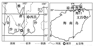 2009年9月14日中国第四个航天发射场——海南航天发射场在海南省文昌市开始动工建设。文昌市位于海南省东北部,地处东经108°21′至东经111°03′,北纬19°20′至北纬20°10′之间,东、南、北三面临海。海南航天发射场是中国在低纬度滨海地区建设的首个航天发射场。下图为我国西昌和文昌卫星发射场地理位置分布比较图。