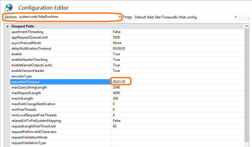 首先我们先尝试重现这个问题,在ASP.NET程序web.config中有一个executionTimeout的设置,默认为110秒,也就是说一个请求的执行时间超过110秒就会timeout从而产生HttpException "Request Timed Out"。requesttimedout这个设置可以通过IIS Configuration Editor或者web.config进行更改。