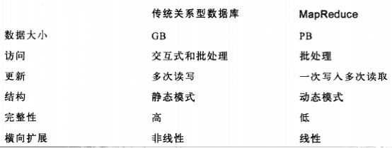 在许多情况下,可以将MapReduce视为关系型管理的补充。两个系统之间的差异如下图: