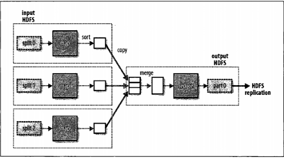 一个reduce任务的完整数据流如下所示。其中虚线框表示节点,虚线箭头表示节点内部的数据传输,而实线箭头表示节点之间的数据传输。