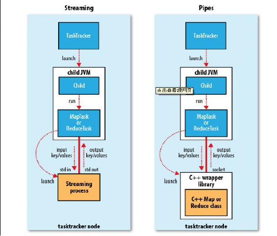 在这两种情况下,在任务执行过程中,java进程会把输入键/值对传给外部的进程,后者通过用户定义的map或reduce函数来执行它并把输出的键值对传回java进程。从TaskTracker的角度看,就像TaskTracker的子进程自己在处理map或reduce代码一样。