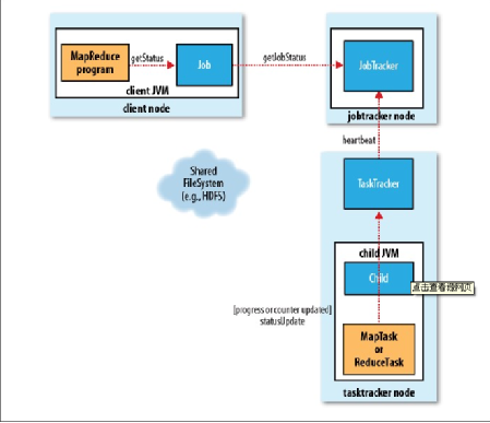 JobTracker将这些更新合并起来,产生一个表明所有运行作业及其所含任务状态的全局视图。最后,如果前面提到的,jobClient通过每秒查询JobTracker来接受最新状态。客户端也可以使用jobclient的getjob()方法来得到一个runningJob的实例,后者包含作业的所有状态信息。