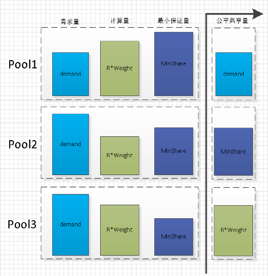 如果一个pool中的demand<R*weight,则该pool的fairShare=demand;