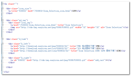 (3)怎样获取每一页所有图标的编号?当然还是通过网页抓取。如下图,通过审查元素,可以看到每一个图标的编号和名称。