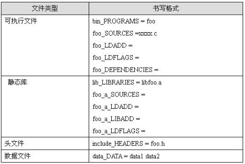 表一列出了可执行文件、静态库、头文件和数据文件,四种书写Makefile.am文件个一般式。makefile.am
