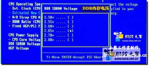 就是来提高给DDR内存供电的电压,DIMM模组的默认电压为2.5V,如果内存品质不好,或是超频了内存,那么可以适当提高一点内存电压,加压幅度尽量不要超过0.5V,不然则有可能会损坏内存!