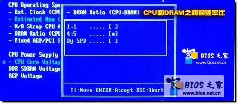 说到这里,又得跟大家解释一下CPU与内存的关系了,内存的工作频率是由外频(FSB)决定的,因此我们在对CPU超频的同时就给内存也增加了运行频率,设置外频与内存总线频率的比值。如果你使用的是DDR333内存,它的标准运行频率可以达到166MHz,由于刚才我们已经把外频设置成了133MHz,因此在此可以选择“4:5”,让内存也运行在最高的频率。