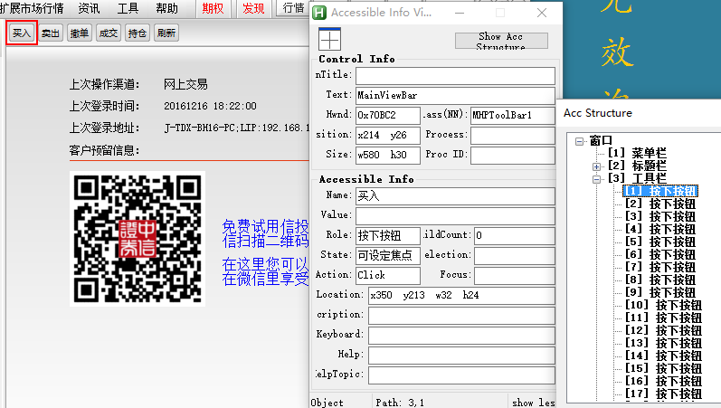 如图所示,"买入","卖出"都是窗口"MainViewBar",自定义类MHPToolBar下子元素,用工具AccViewer可以找到"买入"的层次关系,但自己的遍历代码无法找到role是"工具栏"的对象,找到的role=菜单栏,数据都不对了.主要代码如下: