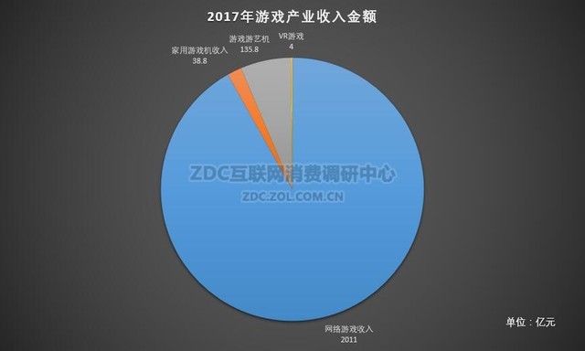 从上图中可以看到,2017年游戏产业收入金额中,网络游戏部分占比非常大,接近92%的占比,而在国内家用游戏机市场开放后,这部分的收入达到了38.8亿元,虽然远不及网络游戏的收入金额,但作为一个在国内“刚起步”的游戏分之,这样的数据还是非常不错的。而VR游戏的年收入只有4亿元,与其他几项相比就显得有一些微不足道了,这也跟2017年VR游戏产业热度明显下降有关,所以在最后的收益表现上就显得略有些尴尬了。