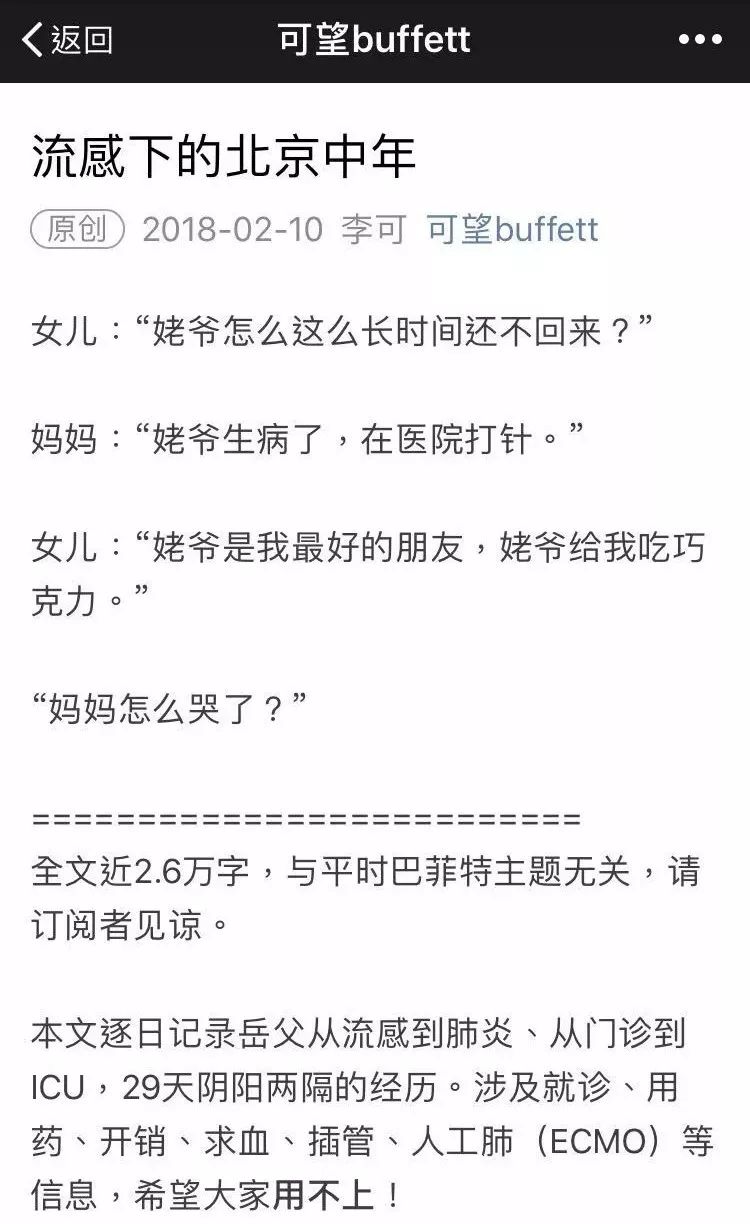 这两天,一篇名为《流感下的北京中年》的2.6万字长文在社交媒体上热传。作者讲述了岳父从流感恶化为肺炎,住进ICU,经历插管、人工肺后,最终去世的故事。