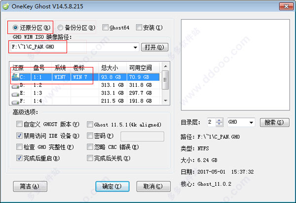 3、如果过了一段时间之后,系统运行比较慢,您需要做的操作是还原C盘。onekey ghost win10版这个时候,您需要选中“还原分区”, 编“GHO WIM ISO映像路径”,选中当初备份的镜像文件,选中C盘,点击“确定”,如下图所示: