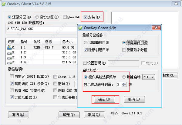 4、如果您需要安装onekey Ghost,您可以选中“安装”选项,便可以设置在开机启动时显示onekey Ghost。