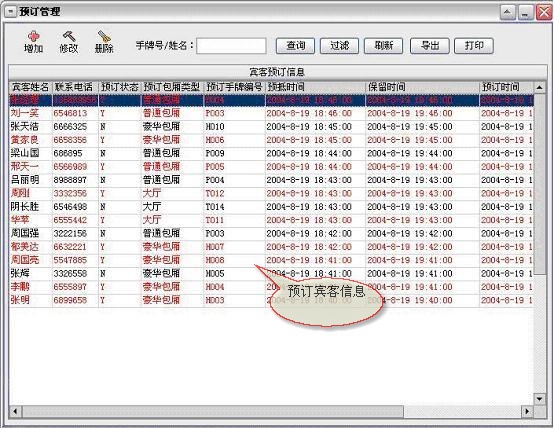 5、预订管理:功能此项功能可以完成增加预订、修改预订、删除预订,预订情况的查询、导出、打印等功能。