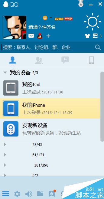 视频文件转换好,就可以去操作视频分享了,首先在电脑端的QQ主版面上找到自己已经登录的手机,双击设备。