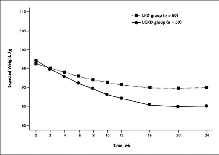 24周内,76%的低脂饮食组志愿者和57%的生酮饮食组志愿者由于各种原因选择退出试验。生酮组平均减重12.9%,非脂肪减重3.3千克,减脂9.4千克;低脂组平均减重6.7%,非脂肪减重2.4千克,减脂4.8千克。非脂肪减重大部分是体内水含量的减少,并非肌肉组织的损耗。血液指标方面,生酮组血清甘油降低0.84mmol/L,高密度脂蛋白胆固醇(HDL)增加0.14mmol/L;低脂组甘油降低则不明显,HDL反而降低。实验两周时,生酮组86%的志愿者尿液中含酮,24周时下降到42%。含量大于6.9mmol/l的,两周时有64%,24周时下降到18%。(高密度脂蛋白胆固醇HDL为所谓“好胆固醇”,低密度脂蛋白胆固醇LDL为所谓“坏胆固醇”。)