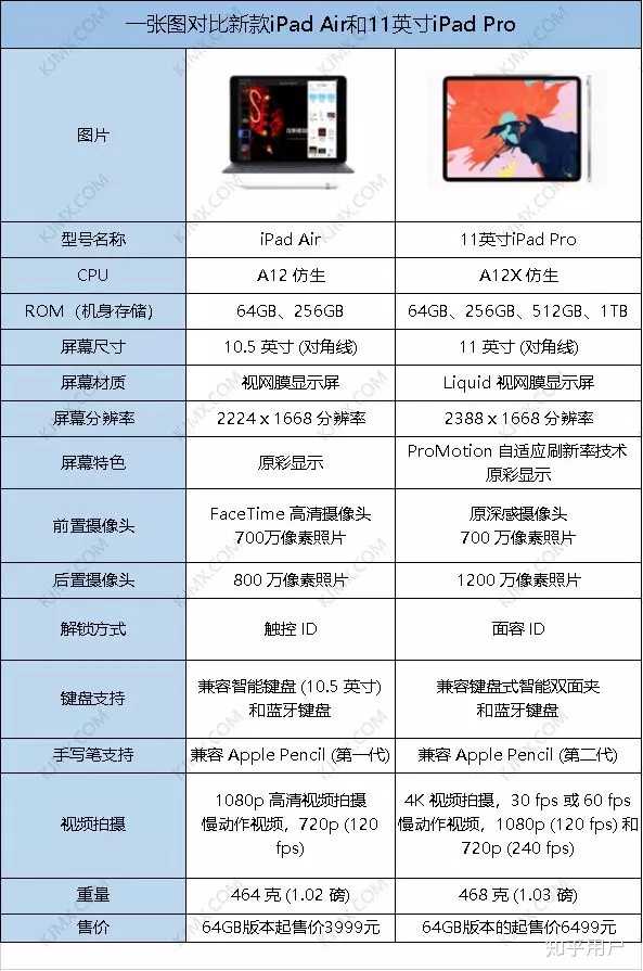 iPadPro的屏幕尺寸为11英寸,新款iPadAir为10.5英寸,解锁方式上iPadPro支持面容ID,而iPadAir则是苹果之前一直沿用的触控指纹,处理器上iPadPro采用A12X,iPadAir为A12,在性能方面,iPadPro无疑要更强劲。