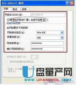 在“网络名称(SSID)”中输入隐藏的wifi名称,此示例为: JCG-000137->选中“即使不广播此网络也要连接”->“网络身份验证”选择: WPA-PSK或WPA2-PSK(哪个是由路由器中隐藏的wifi的安全性类型决定的. 如果您不知道,则可以登录到路由器中查看)->“数据加密”选项也是到在路由器中选择了隐藏的wifi. 如果不确定,请登录路由器设置界面以查看->在“网络密钥”和“确认网络密码”选项之后,填写隐藏的wifi密码->单击“确定”.