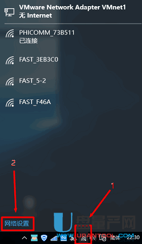 在Windows 10系统屏幕的右下角,单击无线网络图标->选择“网络设置”