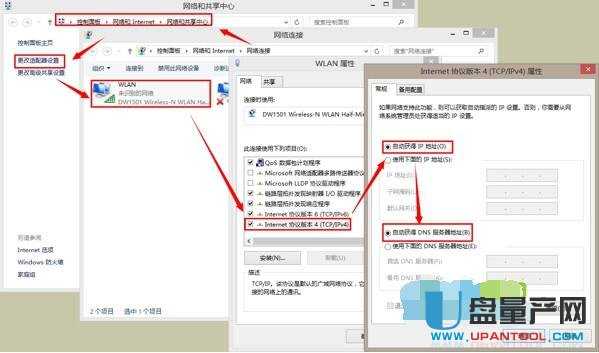 3. 依次找到它们: 控制面板->网络和Internet->网络连接-> wlan->无线网络属性-> ipv4协议->自动获取
