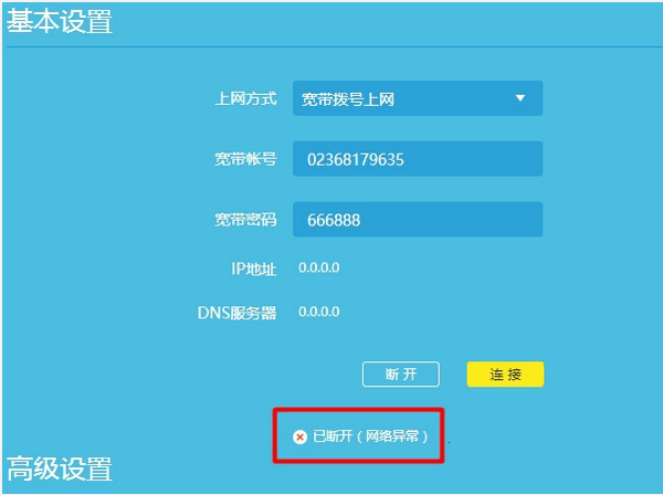 4. 如果此处显示的WAN端口已连接,请检查Internet访问模式是否为拨号模式. 确保您的宽带帐户和密码正确. 如果没有,请重新填写并重新启动路由器.