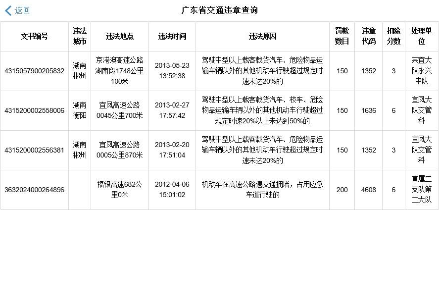在返回的字段中,必须至少有5个字段: 违反时间,违反地点,违反原因(内容),数量和扣除点.