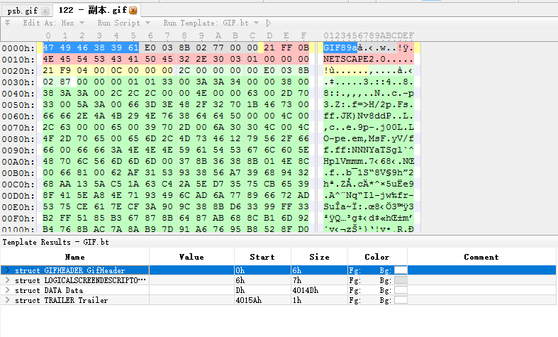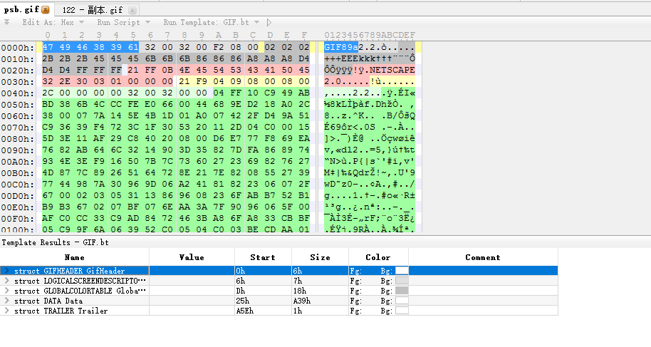 我拍了一张. 结合此动态图片并查看答案将更加详细. vgy.me/igbjuW.gif牺牲了010editor,它有一个半月的试用期,并查看gif的结构,如下所示. 模板是010editor提供的模板结构(意思是模板分析,该文件的结构),请注意,我单击了它,它将显示每个结构对应的bin位置. vgy.me/K6rGFH.gif此运动图片是另一种普通gif. 比较一下中间会有一点区别.