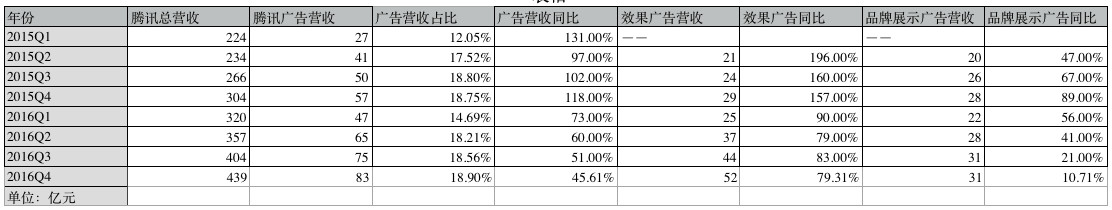 今年3月,腾讯发布了2016年第四季度和全年业绩报告. 报告显示,其网络广告业务收入为82.88亿元,同比增长45%. 在过去两年的财务报告中,广告收入占总收入的百分比也持续增长,并在2016年第四季度创历史新高,占18.9%.