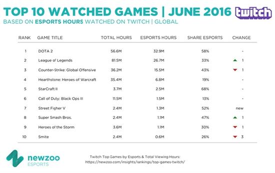 除了今年6月的数据排名外,Twitch还发布了2015年8月至2016年6月的观看数据,其中“英雄联盟”以2.638亿小时的观看时间排名第一全球游戏直播,“ CS: ” GO”和“ Dota2 “其次分别是2.292亿和2.013亿.