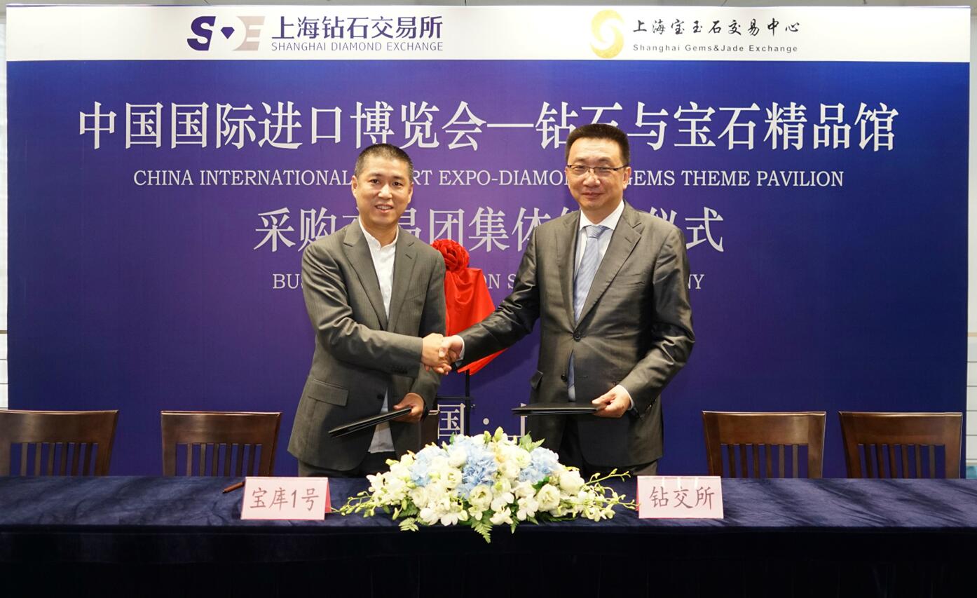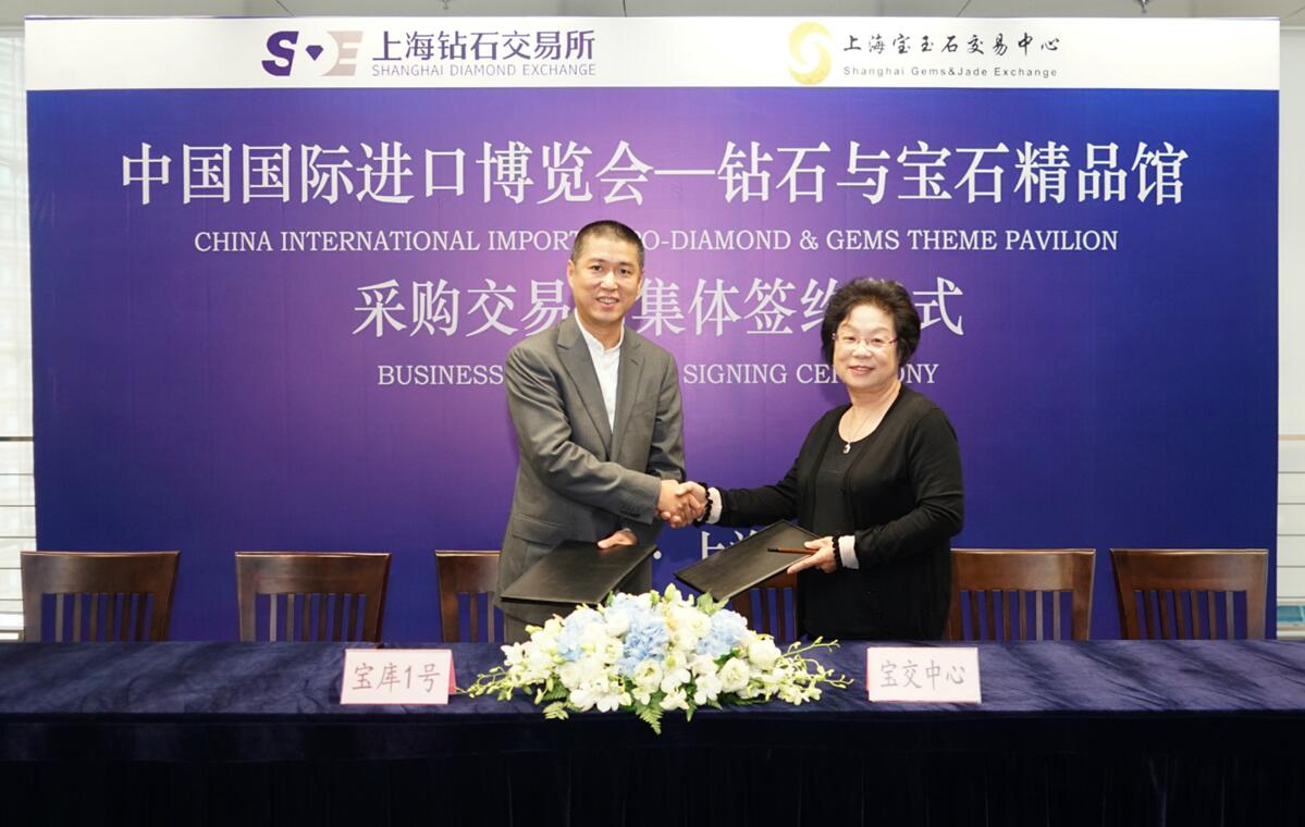 宝库中国的创始人兼首席执行官刘飞国(左)与上海宝玉石材交易中心兼总裁黄云芳(右)签订了合同