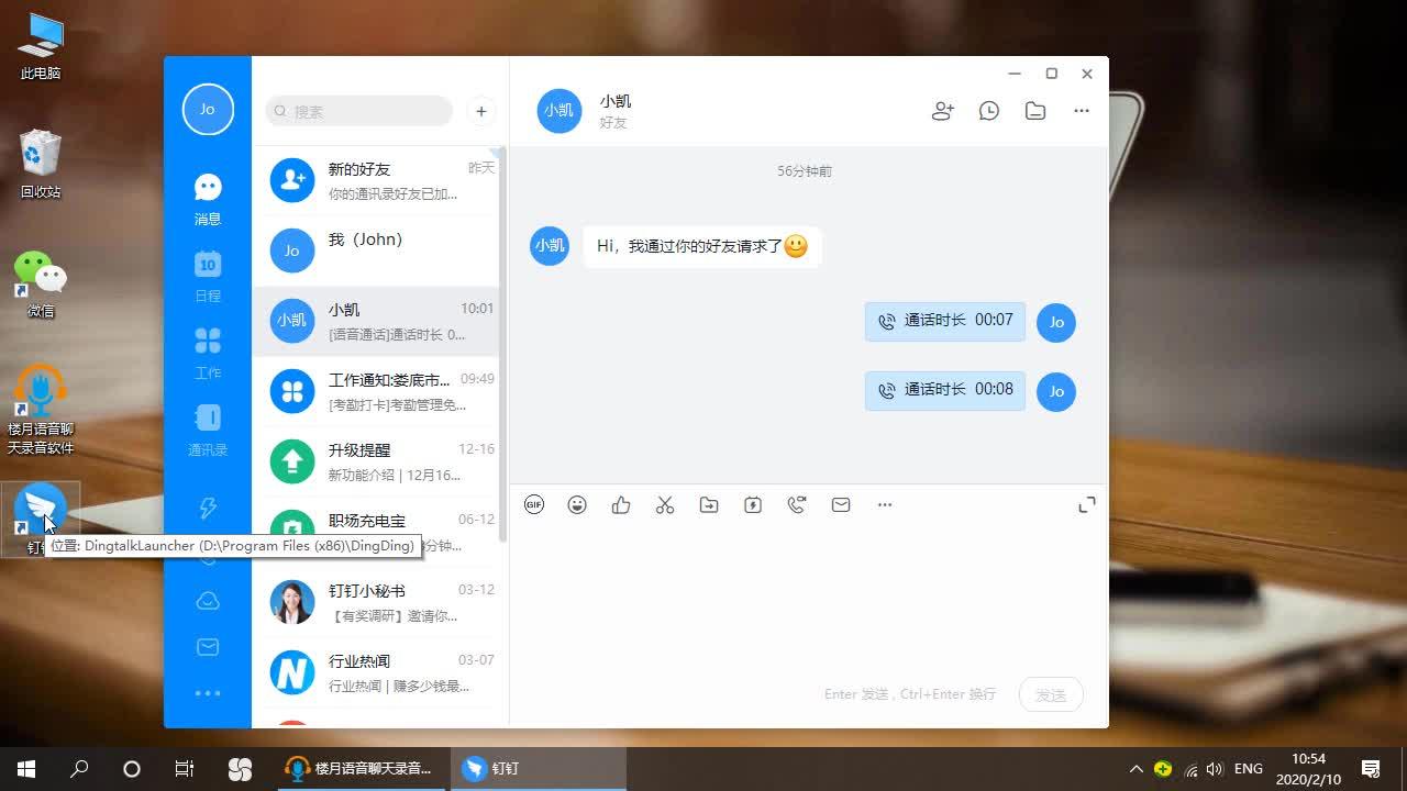 3. 将记录模式设置为“以下程序开始语音和视频聊天时自动记录”(通常该软件默认情况下已选择此选项),并在下面的文本框中添加Alipin软件的进程名称,并使用英语单独带有先前进程名称的逗号同时语音聊天,即输入“,DingTalk.exe”,请注意不要在英语逗号前后输入任何空格.