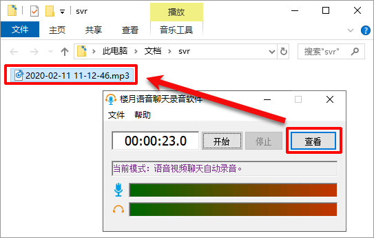 6. 当您停止通话时,软件将自动停止双边录音. 单击查看按钮. 该软件将自动打开资源管理器窗口,并进入保存音频文件的文件夹. 在此文件夹中,您现在可以看到录音. 关于阿里语音通话的内容,可以通过播放音频文件来重新收听双方的语音.