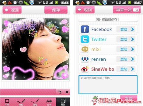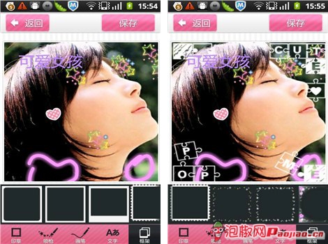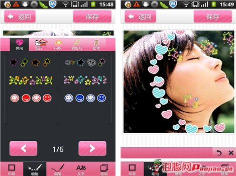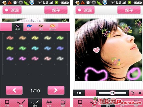 海量的可爱饰品,只要轻轻一点都能出现在照片上哦,小编特别喜欢那种感觉,轻轻一点击,就出现很多可爱的饰品,就好像自己的手是神手似的,连续轻轻划过的时候,会出现一连串很美的图形哦,大家可以试试啦。忘了提醒大家了,里面的小饰品是可以自如放大和缩小的,不过好像不能挪动,实在不满意的话是可以撤销的。