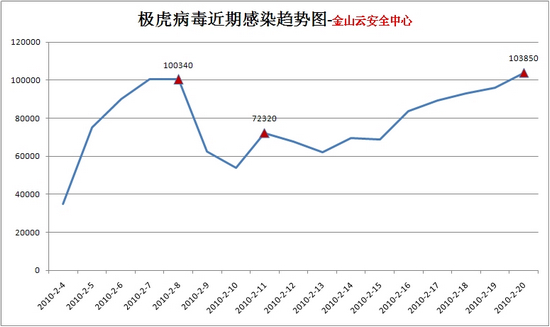 2月23日,金山云安全监测中心发布数据显示,春节长假刚刚结束,极虎病毒的感染量在经过了几天的蛰伏之后,即迅速上升,仅2月20日一天,金山毒霸就帮助10万多用户成功拦截了极虎病毒的攻击。
