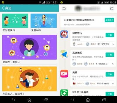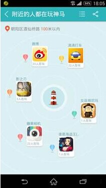“位置分发”可查看附近的人都在用什么App。据360手机助手产品经理介绍,开发这个应用的初衷很简单,就好像我们到了一个新的学校或公司,很多东西很陌生,同事们都用什么APP订餐,用什么APP团购,玩什么游戏,使用360手机助手就可以看到身边的工作圈子里的人都在用什么,类似场景还有很多,比如地铁上、酒吧里等等,其实这是一种隐形的社交功能。