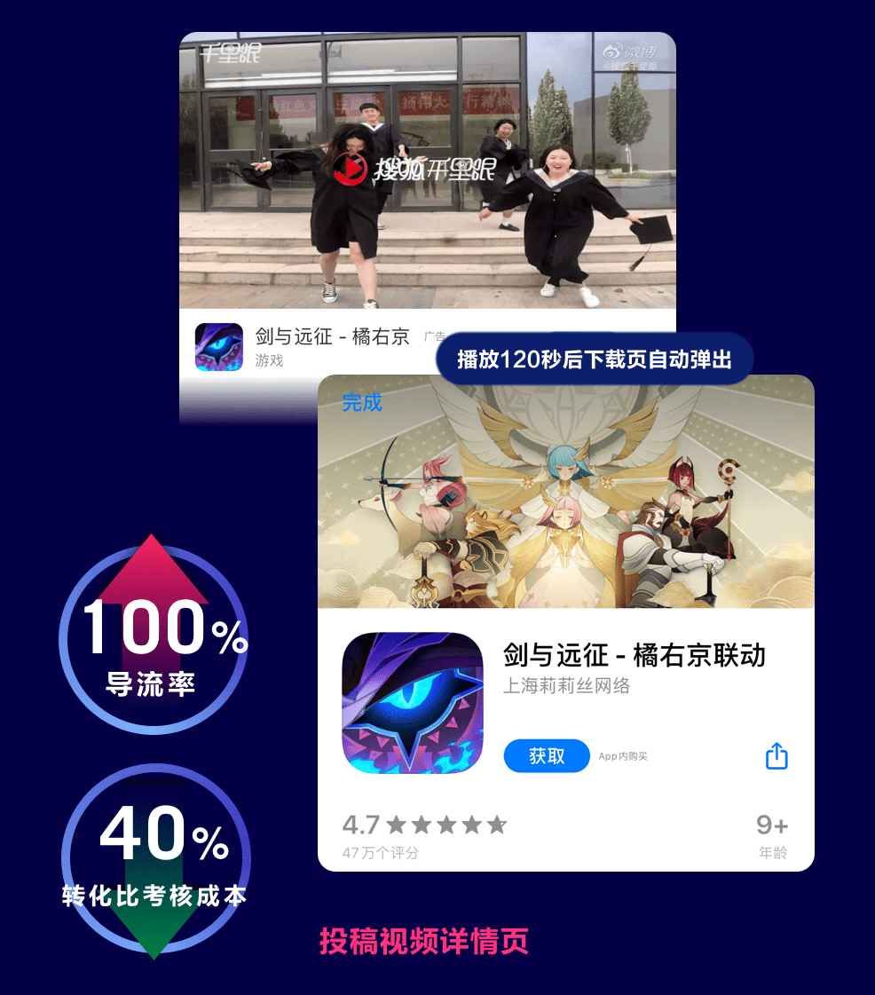 新添加的视频详细信息页面使广告和自然内容更加紧密地结合在一起. 长时间伴随广告的高曝光度视频内容不会影响用户对视频内容的正常观看,并且也更容易实现广告转换和改善营销. 该效果还增强了客户的广告权. 新添加的垂直视频场景提供了广告和内容的原生沉浸式浏览体验,并根据不同的营销目标个性化了不同的广告,以实现更深层次的营销转换. “剑与远征队”提交的视频内容页面随附视频广告,其转移率是前一个的两倍,转换成本不到评估成本的30%-40%.