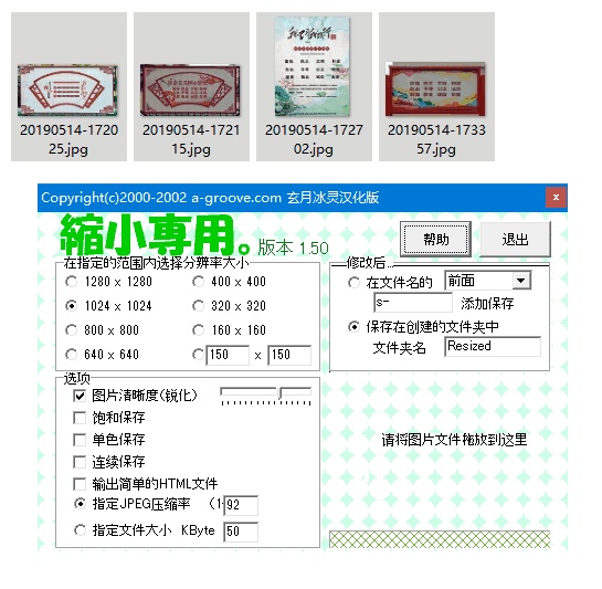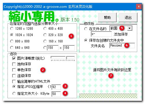 软件可以指定图片的缩小范围(位于上方①),调整图片清晰度和其他选项(位于上方②),以及指定压缩率(位于上方③)或文件大小(位于上方④). . 缩小的图片可以分配一个文件名(在上图中的⑤),也可以保存在新文件夹中(在上图中的⑥).