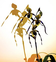 长长的、卷卷的花瓣,像不像皇后拖曳的长裙摆?因特长花瓣而获得“兜兰之后”美名的兜兰,是新民晚报首届上海国际兰展上造型最别致的兰花。灯光投影下,兜兰对影成双,微风吹过,花瓣摇曳生姿,仿佛一出精彩的皮影戏开演了。