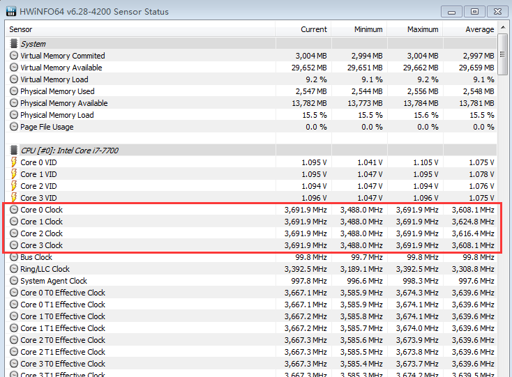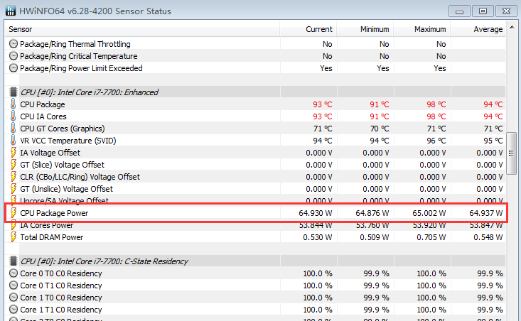 分别对应于CPU的工作频率和功率. 第一列是当前值,第二列是最小值,第三列是最大值,第四列是平均值. 该数据已发生重大变化. 先前的压力测试运行后立即显示数据. 注意温度变化. 您可以运行更多以观察这些值的范围并将它们与以前的标准值进行比较.