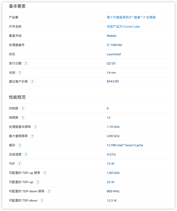 在上图中,i7-10810U的基本频率为1.10GHz,最大核心频率为4.90Ghz,标准TDP为15W. 最后四个参数非常重要,可配置的TDP向上频率,可配置的TDP向下频率,可配置的TDP向下频率,可配置的TDP向下频率.