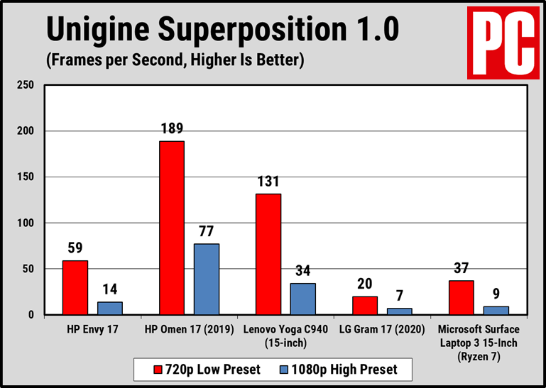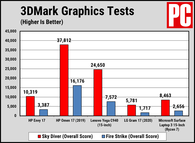 我们的3DMark和叠加游戏基准测试证实了Envy 17在中端游戏中的位置. 这些基准测试通过了详细的3D场景渲染和翻译,以专有分数(3DMark)或每秒帧数(叠加)结果进行衡量. 不出所料,Envy 17的性能略高于Gram 17和Surface Laptop 3,但由于它们具有更强的GPU(瑜伽)或游戏级(Omen)而明显落后于Omen 17和Yoga C940.
