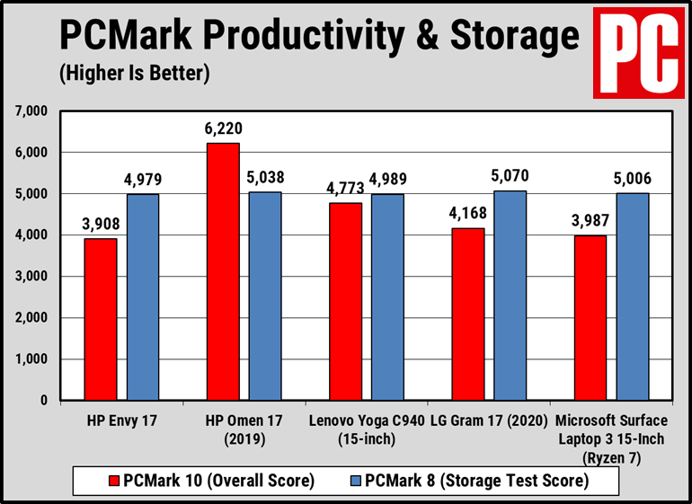 尽管我注意到Envy 17在执行普通的生产力任务和安装应用程序时没有延迟或延迟,但Envy 17的性能确实略低于PCMark 10基准测试中的竞争产品. PCMark 10评估以办公为中心的任务(例如文字处理,电子表格键入,Web浏览和视频会议)的整体系统性能.