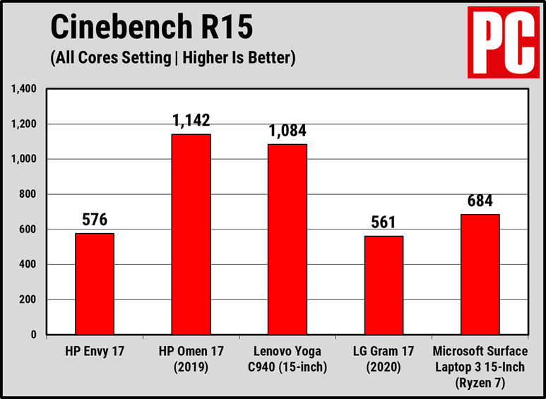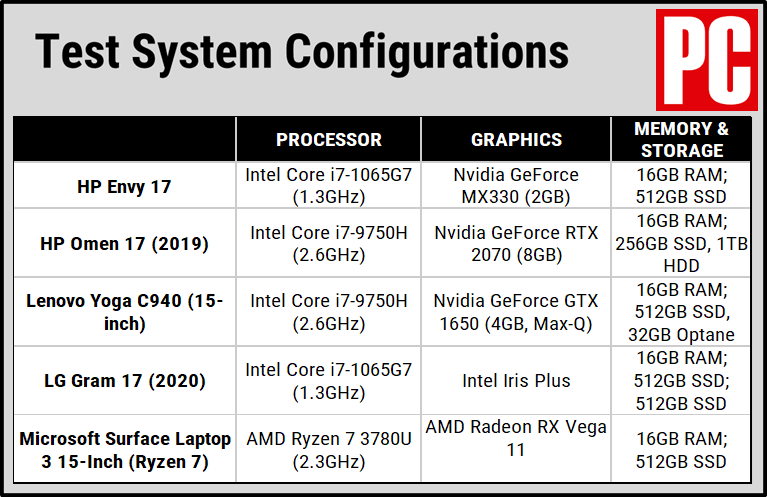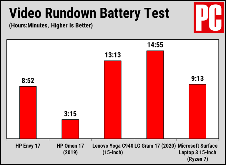 为了评估Envy 17的性能,我们在基准测试中将其与其他几款具有大尺寸显示屏且价格相同的笔记本电脑进行了比较. 除了17英寸的Gram 17,我还比较了17英寸的HP Omen 17游戏笔记本电脑,15英寸的联想Yoga C940 2合1可折叠笔记本电脑和15英寸的Microsoft Surface Laptop 3.