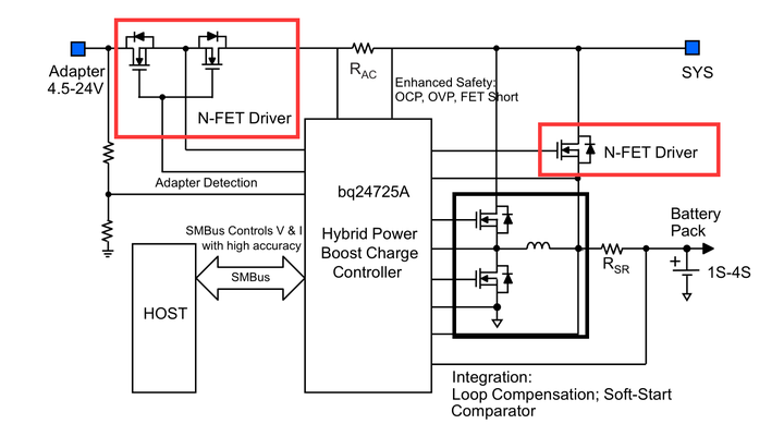 当前大多数笔记本电脑在同一芯片上具有充电控制(Charger)和PPM功能. 以TI的BQ24725A为例: 适配器挂在系统电源总线上,电池通过负载开关连接到总线. ,是典型的电源选择器架构.