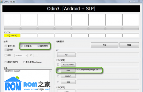 打开Odin3刷机程序后,你会看到下列刷机界面(Odin3 V1.81)。从第一到第三排,都有8个格子,可以同时刷8台机子。你通常只会用的左边第一列而已,因为你只刷一台手机。进入挖煤状态和数据线连好后, “端口”区ID:COM背景变为,里面的数字是串行口号码。“自动重启”和“重设时间”被默认勾上。在“信息”窗口,会显示Added!!这些表示一切正常。