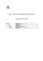 { 基于JA面向对象的学籍管理系统 }体系结构设计说明文件状态:[√] 草稿[ ] 正式发布[ ] 正在修改 文件标识: CZC-1001—02-01 当前版本: 1.0 作 者: 第十组成员 完成日期: 2011年, 9月8日版 本 历 史版本/状态 作者 参与者 起止日期 备注 V1.02011年 月 日 正式版本目 录1. 文档介绍 41.1 文档目的 41.2 文档范围 41.3 读者对象 41.4 参考文献 41.5 术语与缩写解释 42. 系统概述 52.1 功能性需求分类 52.2 学籍信息管理 53. 设计约束 54. 设计策略 65. 系统总体结构 66. 开发环境的配置 67. 运行环境的配置 61. 文档介绍1.1 文档目的本文档用于描述“基于JA面向对象的学籍管理系统”的项目系统总体体系结构设计。1.2 文档范围学生学籍管理系统概要设计:包括系统的主要功能需求以及系统结构及配置。1.3 读者对象广大师生1.4 参考文献提示:列出本文档的所有参考文献(可以是非正式出版物),格式如下:[标识符] 作者,文献名称,出版单位(或归属单位),日期例如:《Thinking in Java》Brucce Eckel 2002《JDK1.6 文档》java.sun.com1.5 术语与缩写解释缩写、术语 解 释 JDK Java Development Kit.面向开发人员使用的SDK JRE Java Runtime Enviroment,Java的运行环境 MyEclipse 开源Java开发工具 OO 面向对象2. 系统概述(1)本系统设计目的解决以往信息传递不方便,不快捷等问题,达到提高工作效率,降低管理系统。