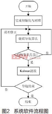 导航计算机软件设计必须满足实时性与准确性的要求。计算机上电后会执行整个系统的初始化,通过后开始捷联惯导算法运算,组合导航算法在GPS数据获取后将其作为初始数据进行运算,如果有GPS数据丢失状况发生,系统将单独运行捷联惯导解算,经解算后的数据被送入Kalman滤波器中处理。系统软件流程图如图2所示。
