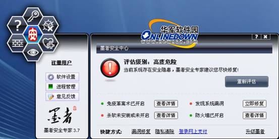 备注:墨者安全专家是一款永久免费的免疫型安全防护软件,集墨者独创的“革离术”、终身免费杀毒、修复系统漏洞、上网痕迹清理、网络防火墙、系统实时保护、安全互助社区等强大功能于一身。特别是独创的“革离术”,利用权限管理等功能,能有效阻止防火墙和杀毒软件尚未识别的安全危险,从源头上杜绝病毒的侵入,从而提高了系统的安全门槛,真正为每一位用户提供全方位的系统安全防护。