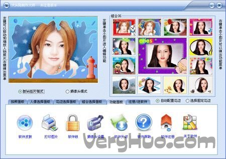 本软件有配有上万种精美花边图案和几十中组合款式,可以任意选择花边和款式拍摄。而且只需一分钟就可拿到所拍摄的照片,照片可以保存为各种类型的图像文件,也可以打印输入在各类纸张上,或用电子邮件方式发送给好友。大头贴制作系统