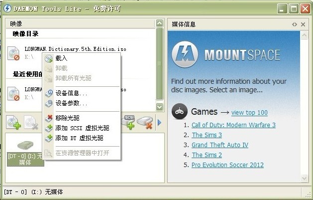 安装后,双击启动daemontools 虚拟光驱,按图所示,右击底下的无媒体光驱,选择载入,找到你下载的ISO文件。