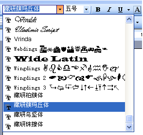 将字体转换为“藏研乌坚体”、“藏研柏簇体”、“藏研珠擦体”或“藏研簇玛丘体”,其中“藏研乌坚体”为印刷体,其它三种为手写体。比如在使用word时,